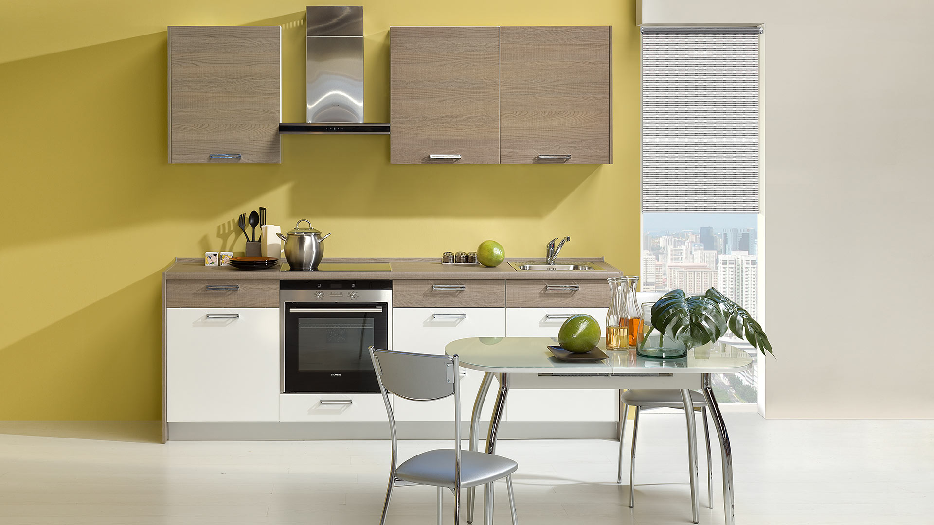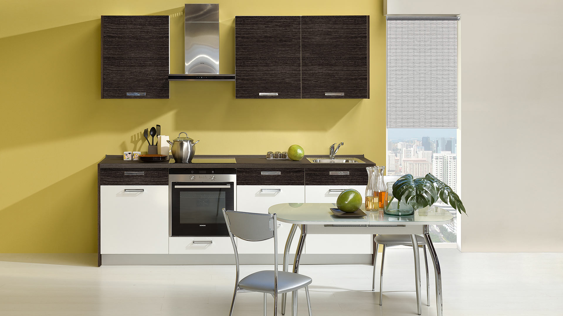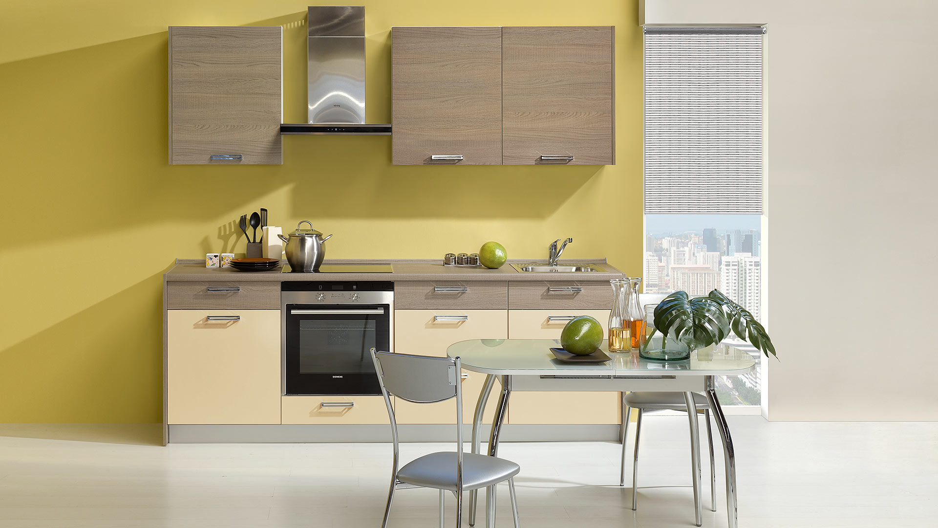 Искусственный шпон – это натуральный материал. В отличие от шпона природного происхождения он имеет однородный рисунок по всей поверхности, а глубина текстуры везде одинакова. Это позволяет создавать кухонные фасады любых размеров и форм в едином выдержанном стиле. В остальном искусственный шпон не уступает своему собрату. Такая же приятная для глаза текстура, живой и тёплый на ощупь материал. Кухня прослужит не один десяток лет без потери первоначального вида. Дополняет комбинацию качественная, надежная и стильная фурнитура. Мы изготовим на заказ любой проект и для небольшой кухни в однокомнатной квартире, и для просторной творческой гастрономической лаборатории частного дома.